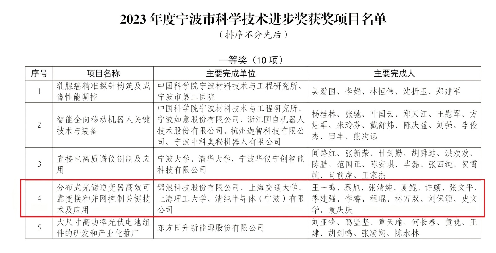 近日,宁波市科学技术局公布了2023年度宁波市科学技术进步奖获奖名单。由锦浪科技股份有限公司牵头,联合清纯半导体(宁波)有限公司共同申报的“分布式光储逆变器高效可靠变换和并网控制关键技术及应用项目”荣获2023年度宁波市科学技术进步奖一等奖,这是宁波市科学技术领域的最高水平奖项之一。